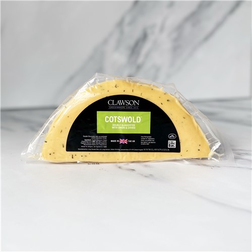 Ingredients: Double Gloucester (Milk, Salt, Annatto Norbixin, Starter Culture, Rennet,  Calcium chloride ), Water, Onion, Chives.