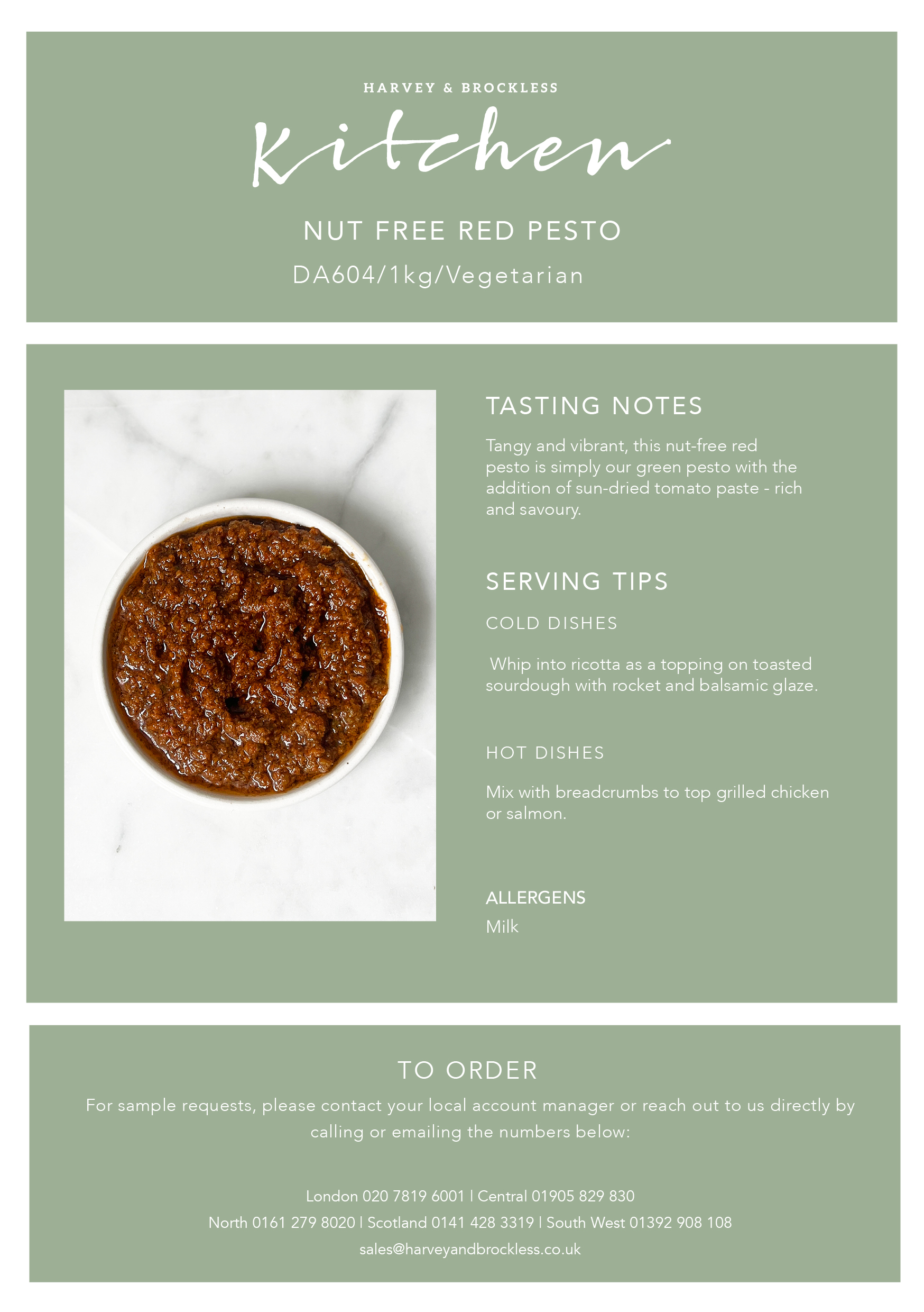 Ingredients: Sundried Tomato Paste (60%) contains Rapeseed Oil, Sundried Tomatoes contains [Sundried Tomato, Salt], Water Basil Puree (24%) contains Basil, Sunflower Oil, Salt, Antioxidant [Ascorbic acid (E300)] Rapeseed Oil Hard Cheese (4%) contains Pasteurised Cow's Milk, Salt, Microbial Rennet, Culture Garlic Puree