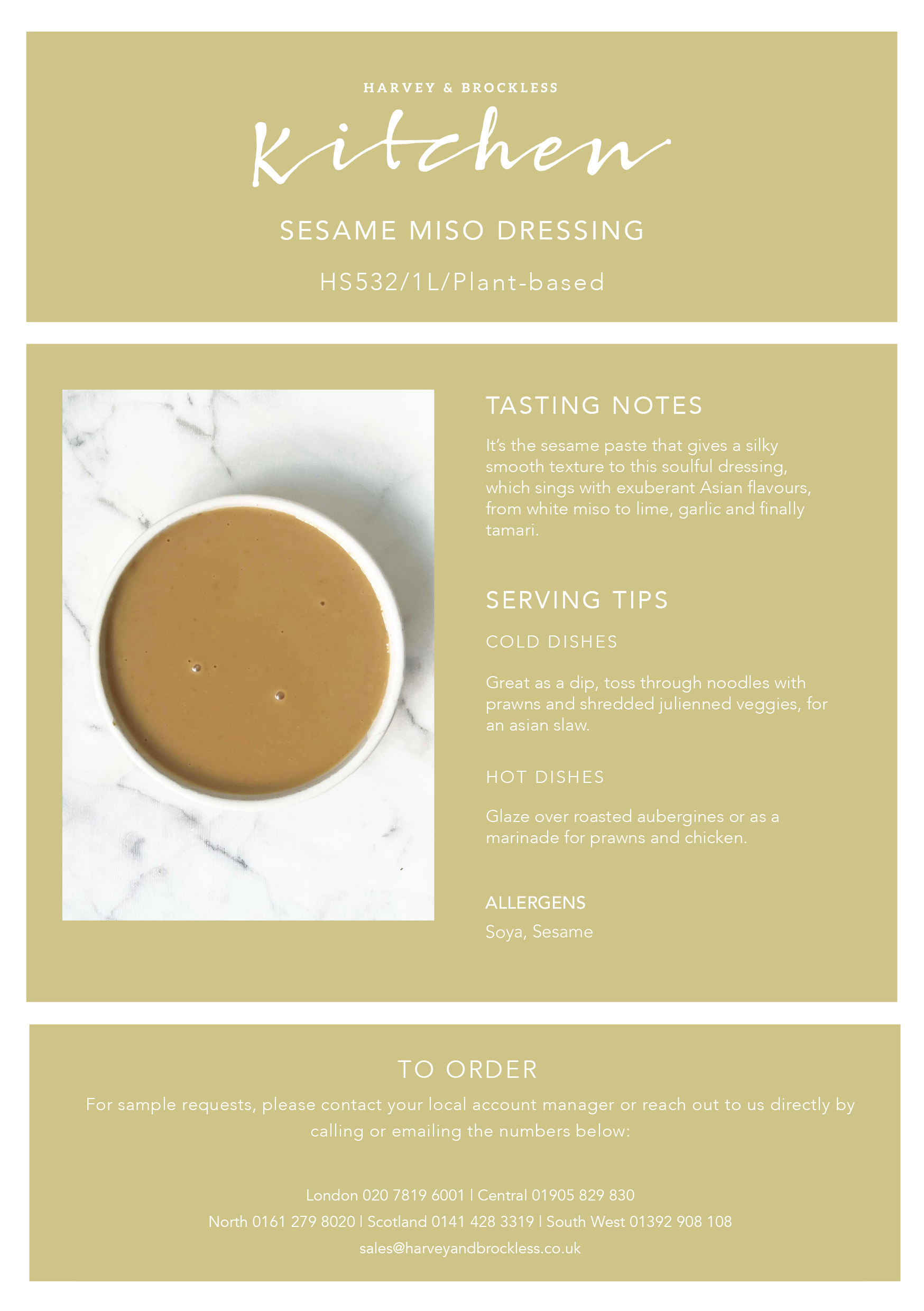 Ingredients: Tahini (Sesame) Paste (17%) Sesame Oil (15%) Water Granulated Sugar White Miso Soya Bean Paste (11%) (Water, Soya Beans, Rice, Salt) Ginger Puree Yutaka Tamari Soy Sauce (Water, Soya Bean, Salt, Rice, Alcohol) Rapeseed Oil Concentrated Lime Juice Rice Wine Vinegar (Rice, Salt, Water) Garlic Puree Preservative: Potassium Sorbate (E202)