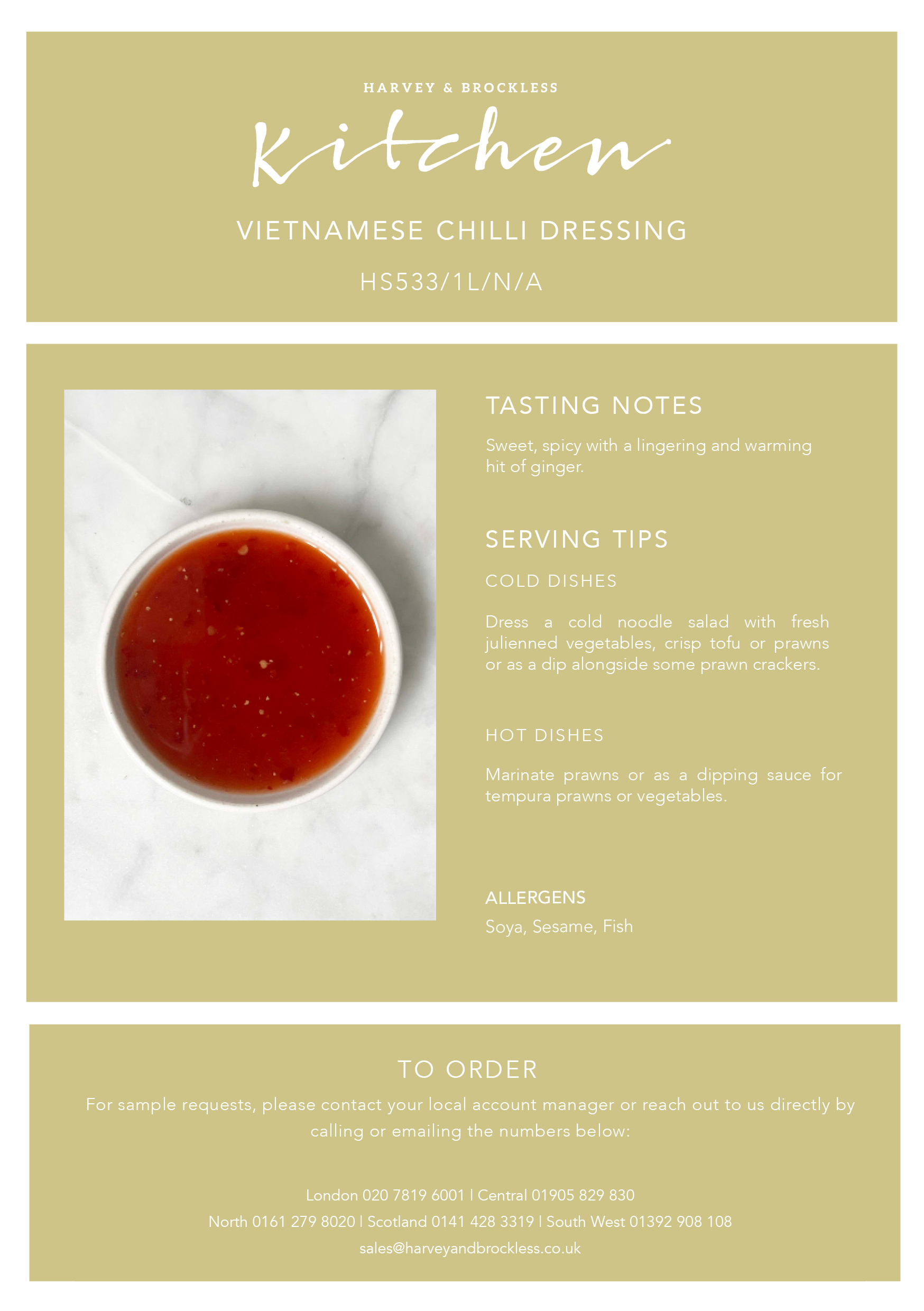 Ingredients: Granulated Sugar, White Wine Vinegar, Water, Tamari Sauce [Whole Soya Bean, Water, Sea Salt, Alcohol, Koji Seed (Aspergillus Oryzae)], Ginger Puree,  Red Chillies (5.2%), Fish Sauce {Anchovy Extract [Anchovy (Fish), Water], Salt, Sugar}, Garlic Puree, Lemon Juice Concentrate,  Sea Salt, Preservative: Potassium Sorbate.